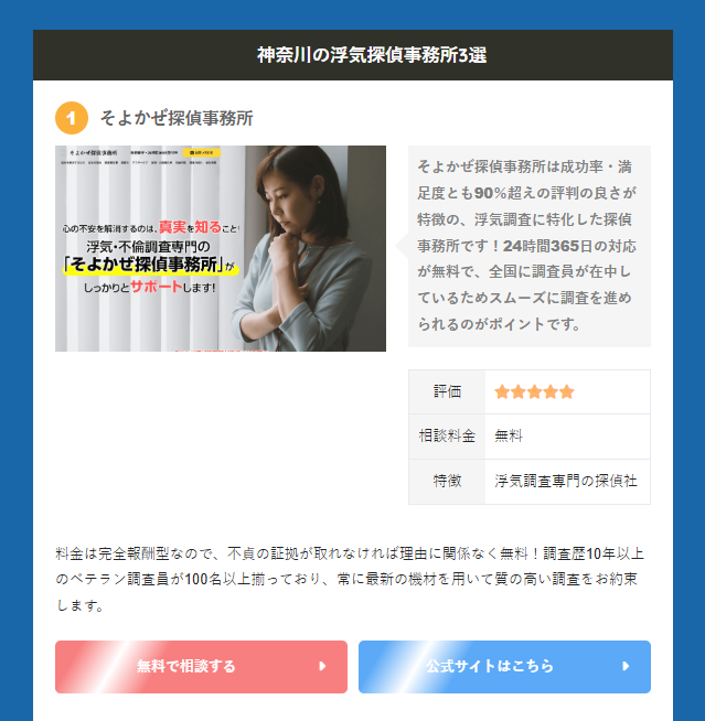 浮気・不倫専門の探偵社「そよかぜ探偵事務所」掲載情報『神奈川県で浮気調査に強いおすすめ探偵事務所16選!』にそよかぜ探偵事務所が掲載されました。