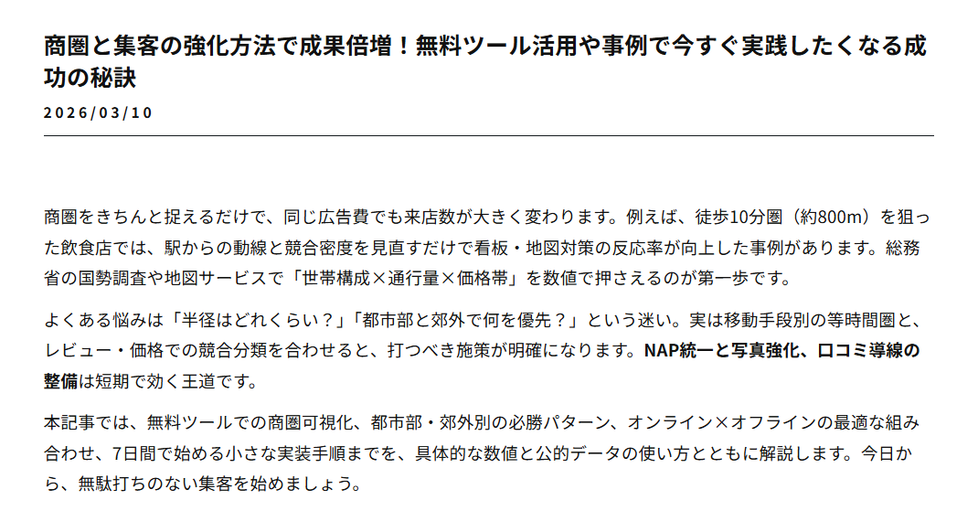 ご紹介いただいた記事では、弊社のように自社でSEO/MEO対策をしている企業に有益な情報を公開されています。